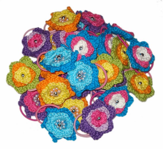 Und ich habe einen Berg von Blumen-Haargummis gehäkelt: